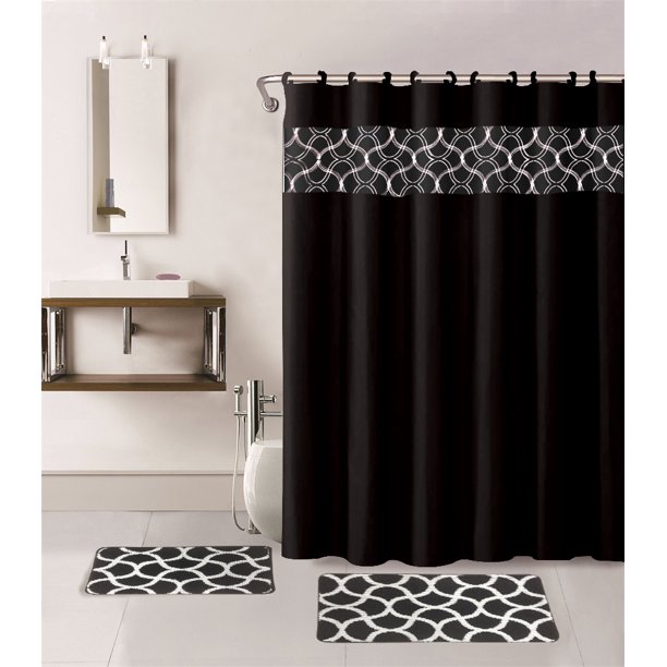 Bathroom 15pc Set Geometric Pattern Coral Design Black Ivory Off Embroider Includes 1 Bath Mat 18 X 30 1 Bath Mat 17 X 24 12 Fabric Hooks 1 Shower Curtain 72 X 72 Anti Slip Walmart Com